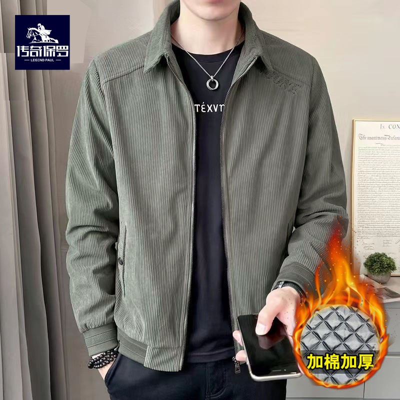 罗春秋季夹克男士翻领上衣服新款加绒棉服冬装潮流休闲商务灯芯绒